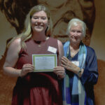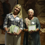 Lynette Evans of award sponsor Scholastic New Zealand with Melanie Koster, winner of the Storylines Joy Cowley Award.