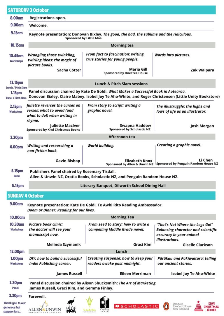 The speakers are: Giselle Clarkson, Graci Kim, Elizabeth Knox, Josh Morgan (Te Aitanga-a-Māhaki, Rongowhakaata, Pākehā), Juliette MacIver, Sacha Cotter, James Russell, Eileen Merriman, Isobel Joy Te Aho-White (Ngāti Kahungunu ki te Wairoa, Ngai Tahu), Gavin Bishop ((Tainui, Ngāti Awa), Maria Gill, Melinda Szymanik, Swapna Haddow, Li Chen, Claire Mabey, Gemma Finlay (Notable PR) and Zak Waipara (Rongowhakaata, Ngāti Porou, Ngāti Ruapani, Ngāti Kahungunu) and Roger Christensen (Little Unity). Our exciting key speakers, as advertised earlier, are Kate de Goldi and Donovan Bixley.
