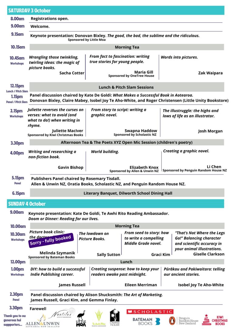 The speakers are: Giselle Clarkson, Graci Kim, Elizabeth Knox, Josh Morgan (Te Aitanga-a-Māhaki, Rongowhakaata, Pākehā), Juliette MacIver, Sacha Cotter, James Russell, Eileen Merriman, Isobel Joy Te Aho-White (Ngāti Kahungunu ki te Wairoa, Ngai Tahu), Gavin Bishop ((Tainui, Ngāti Awa), Maria Gill, Melinda Szymanik, Sally Sutton, Swapna Haddow, Li Chen, Claire Mabey, Gemma Finlay (Notable PR) and Zak Waipara (Rongowhakaata, Ngāti Porou, Ngāti Ruapani, Ngāti Kahungunu) and Roger Christensen (Little Unity). Our exciting key speakers, as advertised earlier, are Kate de Goldi and Donovan Bixley.
